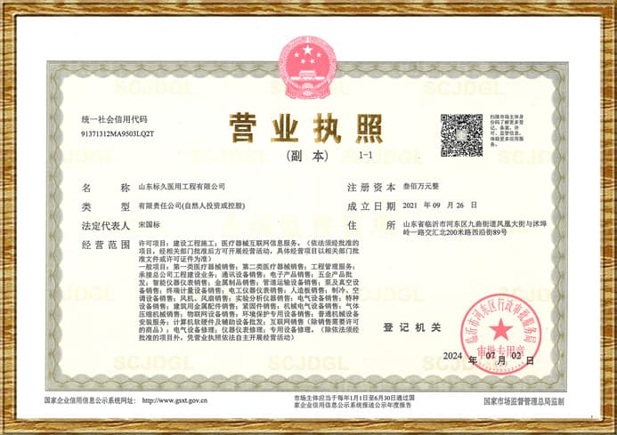 資質(zhì)包括醫(yī)用中心供氧系統(tǒng)、醫(yī)用中心負(fù)壓吸引系統(tǒng)、醫(yī)護(hù)對講系統(tǒng)、醫(yī)院氧氣管道醫(yī)用氣體工程安裝、醫(yī)療氣體系統(tǒng)工程、醫(yī)院手術(shù)室凈化工程、層流潔凈手術(shù)室裝修、實驗室建設(shè)裝飾凈化工程、無塵車間凈化工程設(shè)備的生產(chǎn)加工、批發(fā)銷售與安裝施工資質(zhì)(部分資質(zhì)文件未展示,可索取查閱)。