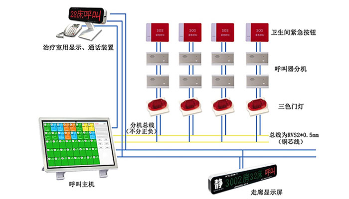 目前醫(yī)院呼叫對講系統(tǒng)大致分為兩類,一類是智能型醫(yī)護(hù)對講系統(tǒng),通過設(shè)立護(hù)士站主機(jī)、病區(qū)走廊顯示屏、病房分機(jī)、衛(wèi)生間緊急按鈕、病房門口門燈等設(shè)備可實(shí)現(xiàn)功能大致有護(hù)士站病房雙向呼叫,語音對講,衛(wèi)生間緊急呼叫,三色門燈分別不同顏色顯示區(qū)分衛(wèi)生間緊急呼叫或分機(jī)等級呼叫,護(hù)士站護(hù)理主機(jī)護(hù)理級別設(shè)置,走廊顯示屏呼叫信息顯示等常規(guī)基本護(hù)理功能。第二類為信息化網(wǎng)絡(luò)呼叫系統(tǒng),這種系統(tǒng)除涵蓋智能型功能的基礎(chǔ)上,可通過與醫(yī)院HIS系統(tǒng)連接實(shí)現(xiàn)病員信息查詢和更新記錄,病房安裝5-7寸液晶顯示分機(jī),患者也可實(shí)時查詢相關(guān)治療和費(fèi)用等信息。